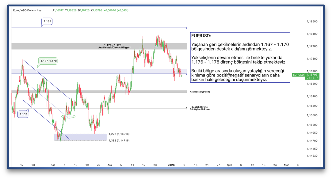 Yaşanan geri çekilmelerin ardından 1.167 - 1.170 bölgesinden destek aldığını görmekteyiz. Yükselişlerin devam etmesi ile birlikte yukarıda 1.176 - 1.178 direnç bölgesini takip etmekteyiz. Bu iki bölge arasında oluşan yataylığın vereceği kırılıma göre pozitif/negatif senaryoların daha baskın hale geleceğini düşünmekteyiz.