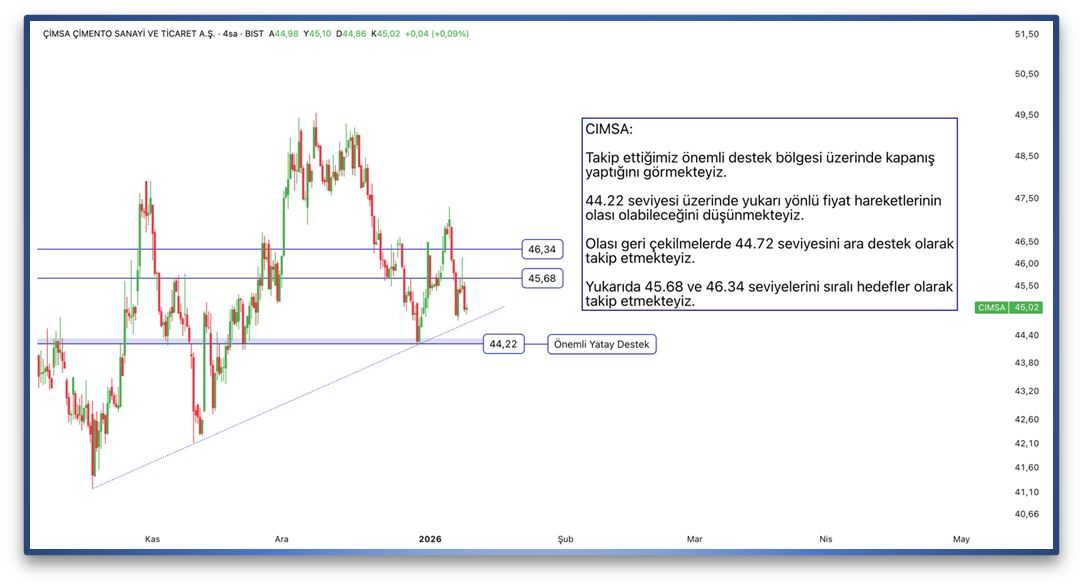 Takip ettiğimiz önemli destek bölgesi üzerinde kapanış yaptığını görmekteyiz. 44.22 seviyesi üzerinde yukarı yönlü fiyat hareketlerinin olası olabileceğini düşünmekteyiz. Olası geri çekilmelerde 44.72 seviyesini ara destek olarak takip etmekteyiz. Yukarıda 45.68 ve 46.34 seviyelerini sıralı hedefler olarak takip etmekteyiz.