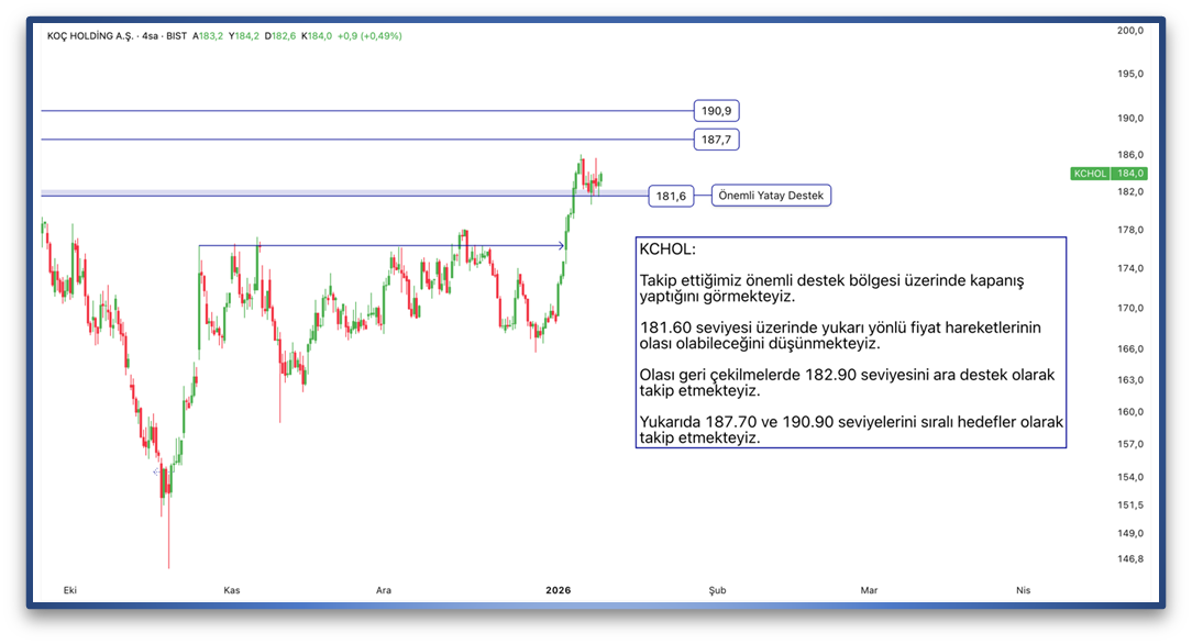 Takip ettiğimiz önemli destek bölgesi üzerinde kapanış yaptığını görmekteyiz. 181.60 seviyesi üzerinde yukarı yönlü fiyat hareketlerinin olası olabileceğini düşünmekteyiz. Olası geri çekilmelerde 182.90 seviyesini ara destek olarak takip etmekteyiz. Yukarıda 187.70 ve 190.90 seviyelerini sıralı hedefler olarak takip etmekteyiz.