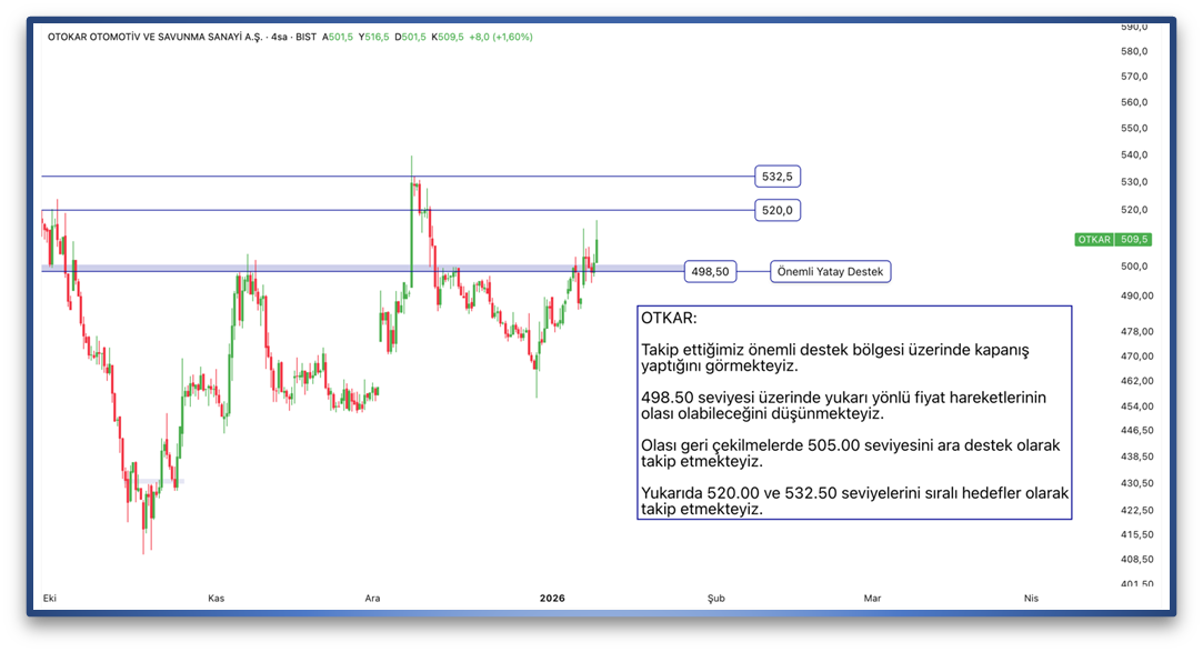 Takip ettiğimiz önemli destek bölgesi üzerinde kapanış yaptığını görmekteyiz. 498.50 seviyesi üzerinde yukarı yönlü fiyat hareketlerinin olası olabileceğini düşünmekteyiz. Olası geri çekilmelerde 505.00 seviyesini ara destek olarak takip etmekteyiz. Yukarıda 520.00 ve 532.50 seviyelerini sıralı hedefler olarak takip etmekteyiz.