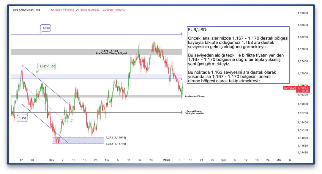 Önceki analizlerimizde 1.167 - 1.170 destek bölgesi kaybıyla takipte olduğumuz 1.163 ara destek seviyesinin gelmiş olduğunu görmekteyiz. Bu seviyeden aldığı tepki ile birlikte fiyatın yeniden 1.167 - 1.170 bölgesine doğru bir tepki yükselişi yaptığını görmekteyiz. Bu noktada 1.163 seviyesini ara destek olarak yukarıda ise 1.167 - 1.170 bölgesini önemli direnç bölgesi olarak takip etmekteyiz.