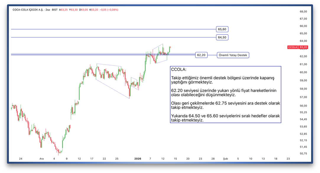 Takip ettiğimiz önemli destek bölgesi üzerinde kapanış yaptığını görmekteyiz. 62.20 seviyesi üzerinde yukarı yönlü fiyat hareketlerinin olası olabileceğini düşünmekteyiz. Olası geri çekilmelerde 62.75 seviyesini ara destek olarak takip etmekteyiz. Yukarıda 64.50 ve 65.60 seviyelerini sıralı hedefler olarak takip etmekteyiz.