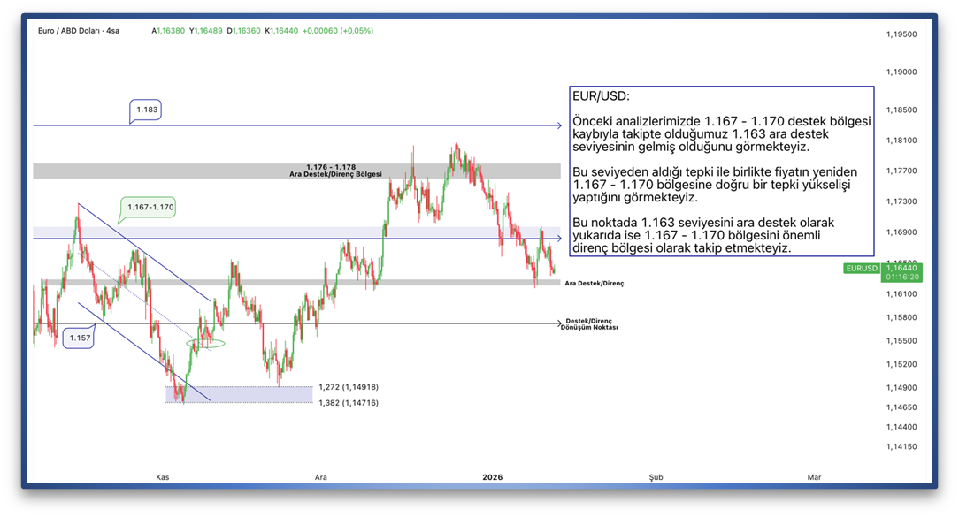 Önceki analizlerimizde 1.167 - 1.170 destek bölgesi kaybıyla takipte olduğumuz 1.163 ara destek seviyesinin gelmiş olduğunu görmekteyiz. Bu seviyeden aldığı tepki ile birlikte fiyatın yeniden 1.167 - 1.170 bölgesine doğru bir tepki yükselişi yaptığını görmekteyiz. Bu noktada 1.163 seviyesini ara destek olarak yukarıda ise 1.167 - 1.170 bölgesini önemli direnç bölgesi olarak takip etmekteyiz.