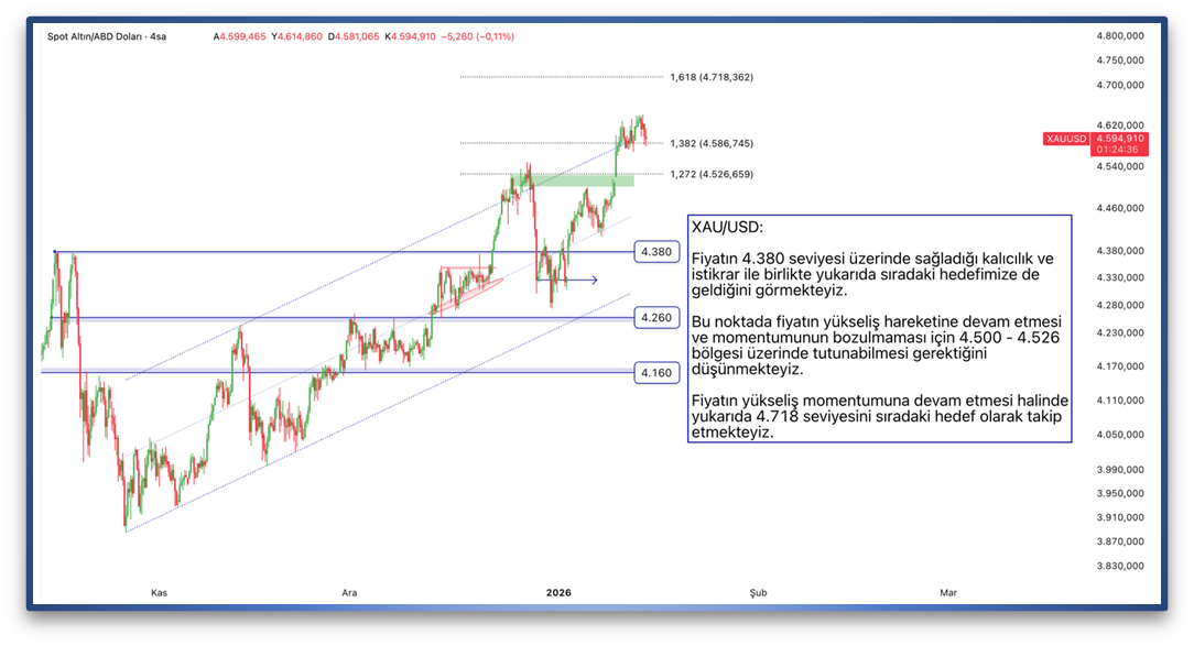 Fiyatın 4.380 seviyesi üzerinde sağladığı kalıcılık ve istikrar ile birlikte yukarıda sıradaki hedefimize de geldiğini görmekteyiz. Bu noktada fiyatın yükseliş hareketine devam etmesi ve momentumunun bozulmaması için 4.500 - 4.526 bölgesi üzerinde tutunabilmesi gerektiğini düşünmekteyiz. Fiyatın yükseliş momentumuna devam etmesi halinde yukarıda 4.718 seviyesini sıradaki hedef olarak takip etmekteyiz.