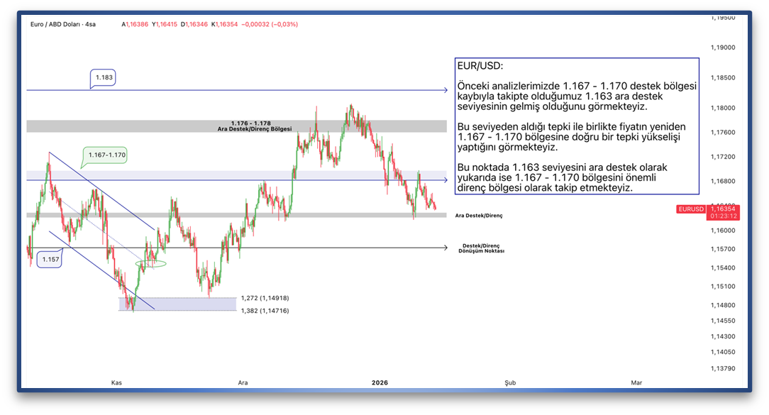 Önceki analizlerimizde 1.167 - 1.170 destek bölgesi kaybıyla takipte olduğumuz 1.163 ara destek seviyesinin gelmiş olduğunu görmekteyiz. Bu seviyeden aldığı tepki ile birlikte fiyatın yeniden 1.167 - 1.170 bölgesine doğru bir tepki yükselişi yaptığını görmekteyiz. Bu noktada 1.163 seviyesini ara destek olarak yukarıda ise 1.167 - 1.170 bölgesini önemli direnç bölgesi olarak takip etmekteyiz.