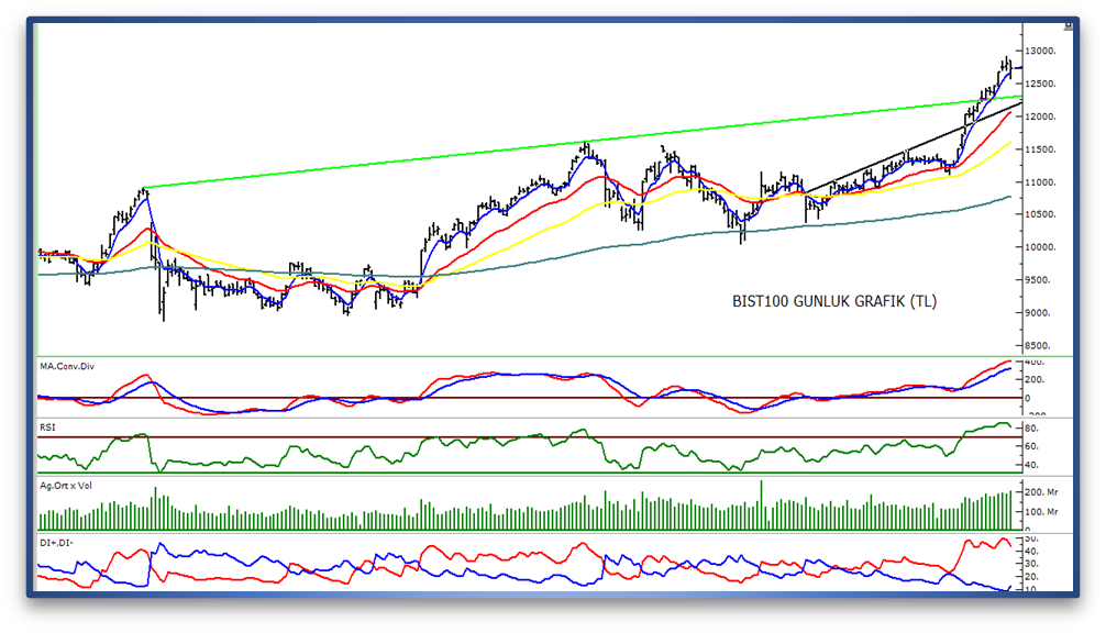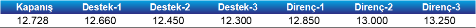 - Dünkü geri çekilmede kısa vadeli trend açısından izlediğimiz 5 günlük üssel hareketli ortalamanın altına sarkılsa da gün sonu kapanış bu seviyenin üzerinde gerçekleşti. Söz konusu ortalama bugün 12.660 seviyesinden başlıyor ve olası geri çekilmelerde ilk destek konumunda izleyeceğiz. Bu seviyenin altında ise 12.450 puan bölgesini önemli bir destek alanı olarak önemsemekteyiz.