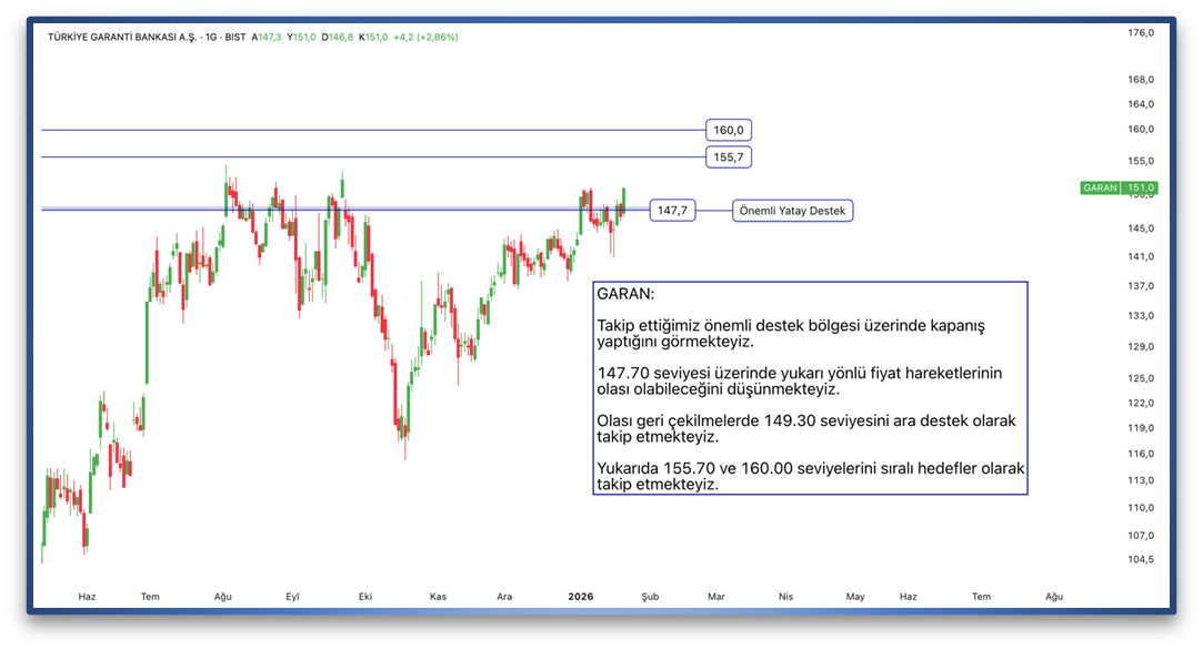 Takip ettiğimiz önemli destek bölgesi üzerinde kapanış yaptığını görmekteyiz. 147.70 seviyesi üzerinde yukarı yönlü fiyat hareketlerinin olası olabileceğini düşünmekteyiz. Olası geri çekilmelerde 149.30 seviyesini ara destek olarak takip etmekteyiz. Yukarıda 155.70 ve 160.00 seviyelerini sıralı hedefler olarak takip etmekteyiz.