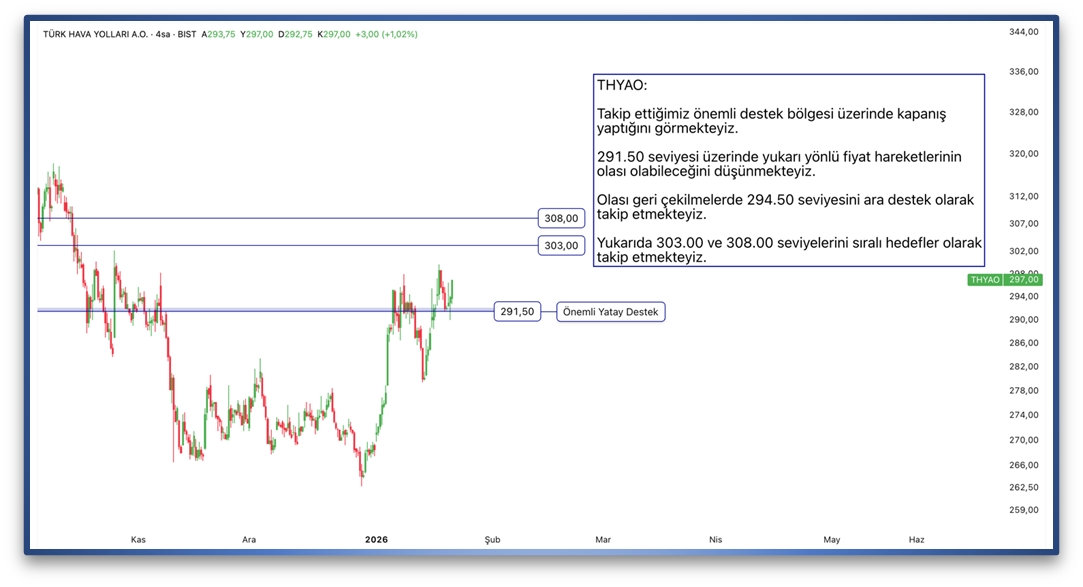 Takip ettiğimiz önemli destek bölgesi üzerinde kapanış yaptığını görmekteyiz. 291.50 seviyesi üzerinde yukarı yönlü fiyat hareketlerinin olası olabileceğini düşünmekteyiz. Olası geri çekilmelerde 294.50 seviyesini ara destek olarak takip etmekteyiz. Yukarıda 303.00 ve 308.00 seviyelerini sıralı hedefler olarak takip etmekteyiz.