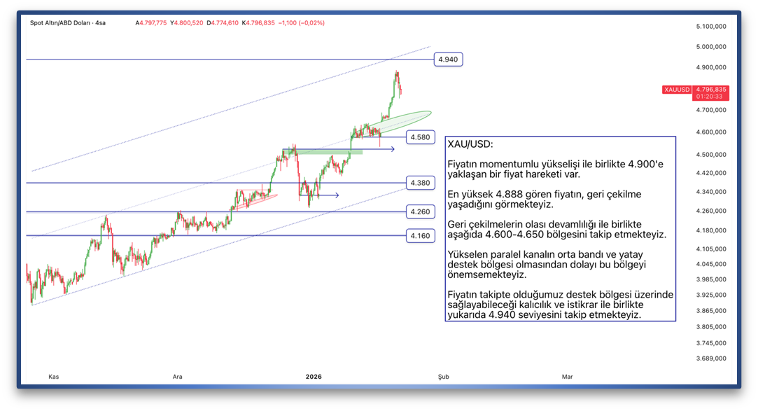 Fiyatın momentumlu yükselişi ile birlikte 4.900'e yaklaşan bir fiyat hareketi var. En yüksek 4.888 gören fiyatın, geri çekilme yaşadığını görmekteyiz. Geri çekilmelerin olası devamlılığı ile birlikte aşağıda 4.600-4.650 bölgesini takip etmekteyiz. Yükselen paralel kanalın orta bandı ve yatay destek bölgesi olmasından dolayı bu bölgeyi önemsemekteyiz. Fiyatın takipte olduğumuz destek bölgesi üzerinde sağlayabileceği kalıcılık ve istikrar ile birlikte yukarıda 4.940 seviyesini takip etmekteyiz.