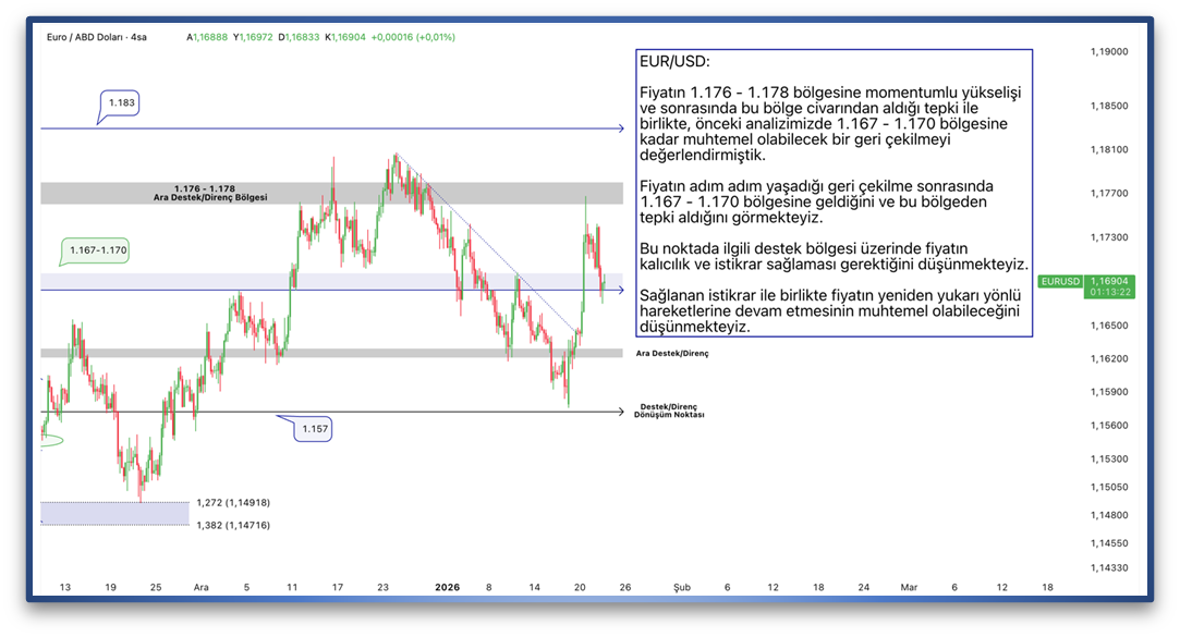 Fiyatın 1.176 - 1.178 bölgesine momentumlu yükselişi ve sonrasında bu bölge civarından aldığı tepki ile birlikte, önceki analizimizde 1.167 - 1.170 bölgesine kadar muhtemel olabilecek bir geri çekilmeyi değerlendirmiştik. Fiyatın adım adım yaşadığı geri çekilme sonrasında 1.167 - 1.170 bölgesine geldiğini ve bu bölgeden tepki aldığını görmekteyiz. Bu noktada ilgili destek bölgesi üzerinde fiyatın kalıcılık ve istikrar sağlaması gerektiğini düşünmekteyiz. Sağlanan istikrar ile birlikte fiyatın yeniden yukarı yönlü hareketlerine devam etmesinin muhtemel olabileceğini düşünmekteyiz.