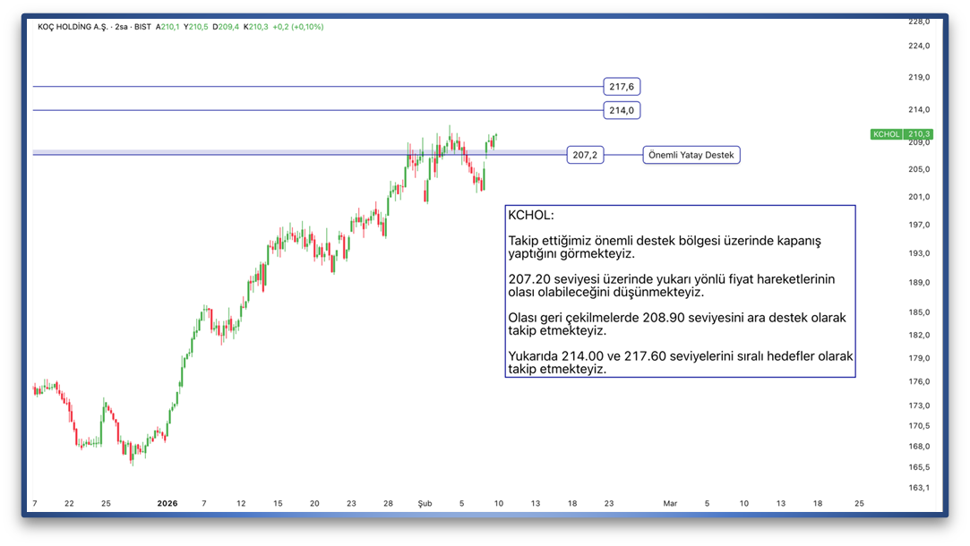 Takip ettiğimiz önemli destek bölgesi üzerinde kapanış yaptığını görmekteyiz. 207.20 seviyesi üzerinde yukarı yönlü fiyat hareketlerinin olası olabileceğini düşünmekteyiz. Olası geri çekilmelerde 208.90 seviyesini ara destek olarak takip etmekteyiz. Yukarıda 214.00 ve 217.60 seviyelerini sıralı hedefler olarak takip etmekteyiz.