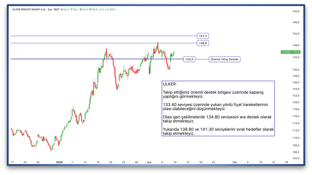 Takip ettiğimiz önemli destek bölgesi üzerinde kapanış yaptığını görmekteyiz. 133.40 seviyesi üzerinde yukarı yönlü fiyat hareketlerinin olası olabileceğini düşünmekteyiz. Olası geri çekilmelerde 134.80 seviyesini ara destek olarak takip etmekteyiz. Yukarıda 138.80 ve 141.30 seviyelerini sıralı hedefler olarak takip etmekteyiz.