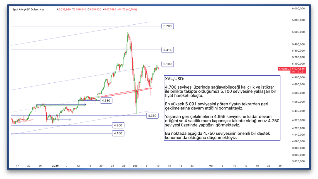 4.700 seviyesi üzerinde sağlayabileceği kalıcılık ve istikrar ile birlikte takipte olduğumuz 5.100 seviyesine yaklaşan bir fiyat hareketi oluştu. En yüksek 5.091 seviyesini gören fiyatın tekrardan geri çekilmelerine devam ettiğini görmekteyiz. Yaşanan geri çekilmelerin 4.655 seviyesine kadar devam ettiğini ve 4 saatlik mum kapanışını takipte olduğumuz 4.750 seviyesi üzerinde yaptığını görmekteyiz. Bu noktada aşağıda 4.750 seviyesinin önemli bir destek konumunda olduğunu düşünmekteyiz.
