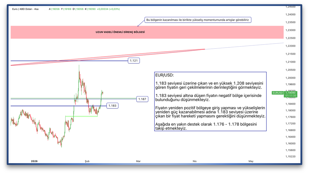 1.183 seviyesi üzerine çıkan ve en yüksek 1.208 seviyesini gören fiyatın geri çekilmelerinin derinleştiğini görmekteyiz. 1.183 seviyesi altına düşen fiyatın negatif bölge içerisinde bulunduğunu düşünmekteyiz. Fiyatın yeniden pozitif bölgeye giriş yapması ve yükselişlerin yeniden güç kazanabilmesi adına 1.183 seviyesi üzerine çıkan bir fiyat hareketi yapmasını gerektiğini düşünmekteyiz. Aşağıda en yakın destek olarak 1.176 - 1.178 bölgesini takip etmekteyiz.