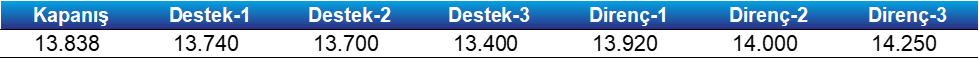- Geri çekilmelerde 13.740 - 13.700 seviyelerini kısa vadeli destekler olarak takip edeceğiz. Bu seviyenin aşağı yönlü kırılması halinde satışlar yeniden etkili olabilir ve 13.400 destek bölgesine doğru geri çekilme görebileceğimizi değerlendiriyoruz.