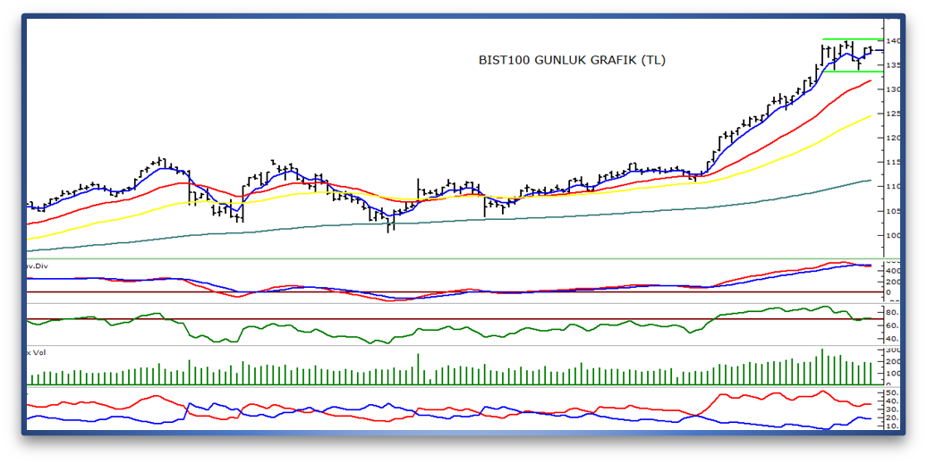 - Teknik açıdan bakıldığında, endekste kısa vadede 13.400 - 14.000 seviyeleri arasındaki yatay kanal içinde fiyatlamanın sürdüğünü görüyoruz. Dün kapanış itibarıyla kısa vadeli görünümde takip ettiğimiz 5 günlük üssel hareketli ortalamanın (13.730) üzerindeyiz. Bu ortalamanın üzerinde kalıcılık sağlanması halinde kısa vadede 13.920 ve 14.000 direnç seviyelerini takip edeceğiz.
