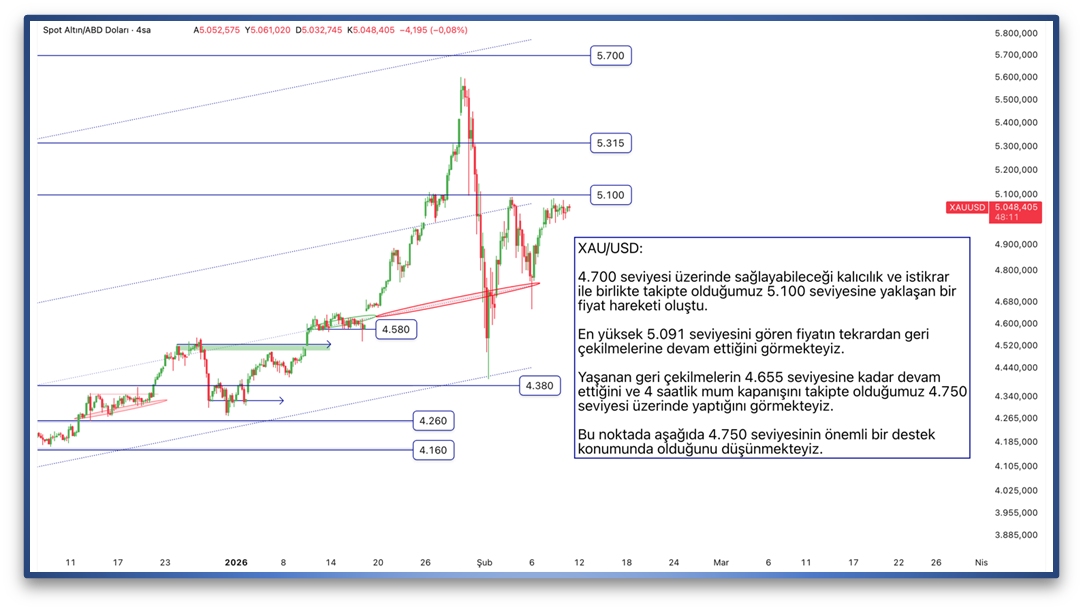 4.700 seviyesi üzerinde sağlayabileceği kalıcılık ve istikrar ile birlikte takipte olduğumuz 5.100 seviyesine yaklaşan bir fiyat hareketi oluştu. En yüksek 5.091 seviyesini gören fiyatın tekrardan geri çekilmelerine devam ettiğini görmekteyiz. Yaşanan geri çekilmelerin 4.655 seviyesine kadar devam ettiğini ve 4 saatlik mum kapanışını takipte olduğumuz 4.750 seviyesi üzerinde yaptığını görmekteyiz. Bu noktada aşağıda 4.750 seviyesinin önemli bir destek konumunda olduğunu düşünmekteyiz.