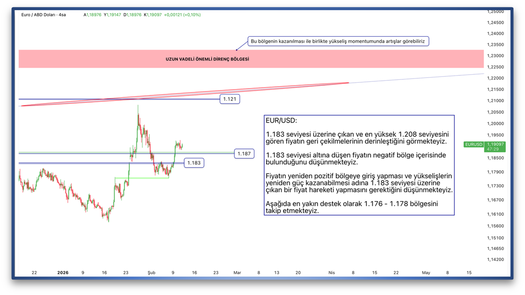 EUR/USD: 1.183 seviyesi üzerine çıkan ve en yüksek 1.208 seviyesini gören fiyatın geri çekilmelerinin derinleştiğini görmekteyiz. 1.183 seviyesi altına düşen fiyatın negatif bölge içerisinde bulunduğunu düşünmekteyiz. Fiyatın yeniden pozitif bölgeye giriş yapması ve yükselişlerin yeniden güç kazanabilmesi adına 1.183 seviyesi üzerine çıkan bir fiyat hareketi yapmasını gerektiğini düşünmekteyiz. Aşağıda en yakın destek olarak 1.176 - 1.178 bölgesini takip etmekteyiz.