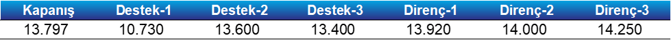 - Olası geri çekilmelerde 13.730 desteğinin aşağı yönlü kırılması durumunda satış baskısı artabilir. Bu senaryoda 13.600 ara destek olmak üzere, 13.400 yatay kanal destek bölgesi yeniden gündeme gelebileceğini tahmin ediyoruz.