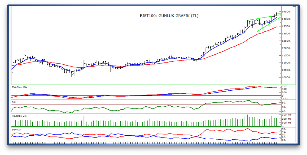 - BIST 100 endeksi, dünkü işlemleri %1,12 yükselişle 14.339 seviyesinden tamamladı. Endeks güne 14.269 puandan alıcılı bir görünümle başladıktan sonra gün içinde 14.207 - 14.433 puan aralığında dalgalı bir seyir izledi. Endekste rekor kapanış serisi devam ederken, işlem hacmi yaklaşık 217 milyar TL seviyesinde gerçekleşti.