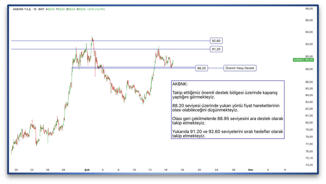 AKBNK: Takip ettiğimiz önemli destek bölgesi üzerinde kapanış yaptığını görmekteyiz. 88.20 seviyesi üzerinde yukarı yönlü fiyat hareketlerinin olası olabileceğini düşünmekteyiz. Olası geri çekilmelerde 88.95 seviyesini ara destek olarak takip etmekteyiz. Yukarıda 91.20 ve 92.60 seviyelerini sıralı hedefler olarak takip etmekteyiz.