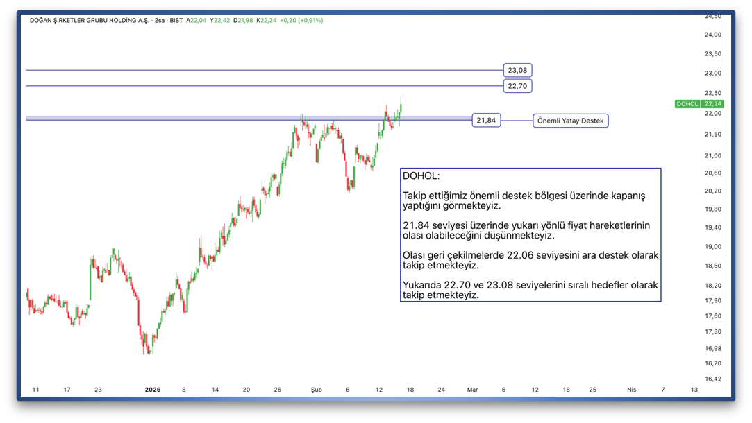 DOHOL: Takip ettiğimiz önemli destek bölgesi üzerinde kapanış yaptığını görmekteyiz. 21.84 seviyesi üzerinde yukarı yönlü fiyat hareketlerinin olası olabileceğini düşünmekteyiz. Olası geri çekilmelerde 22.06 seviyesini ara destek olarak takip etmekteyiz. Yukarıda 22.70 ve 23.08 seviyelerini sıralı hedefler olarak takip etmekteyiz.