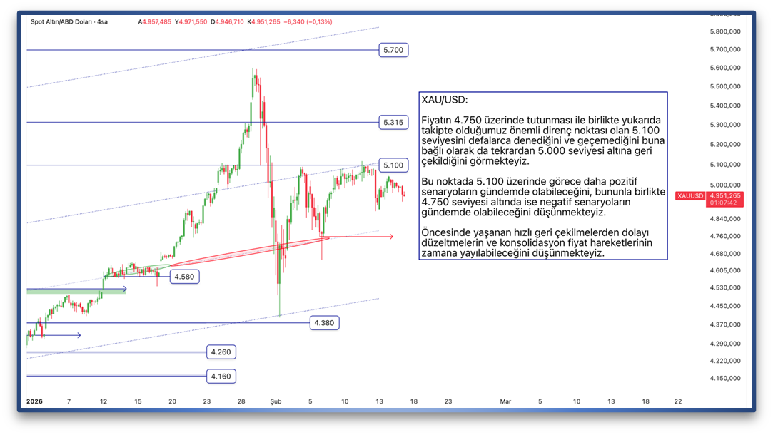 Fiyatın 4.750 üzerinde tutunması ile birlikte yukarıda takipte olduğumuz önemli direnç noktası olan 5.100 seviyesini defalarca denediğini ve geçemediğini buna bağlı olarak da tekrardan 5.000 seviyesi altına geri çekildiğini görmekteyiz. Bu noktada 5.100 üzerinde görece daha pozitif senaryoların gündemde olabileceğini, bununla birlikte 4.750 seviyesi altında ise negatif senaryoların gündemde olabileceğini düşünmekteyiz. Öncesinde yaşanan hızlı geri çekilmelerden dolayı düzeltmelerin ve konsolidasyon fiyat hareketlerinin zamana yayılabileceğini düşünmekteyiz.