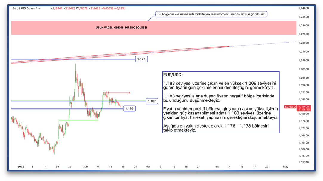 1.183 seviyesi üzerine çıkan ve en yüksek 1.208 seviyesini gören fiyatın geri çekilmelerinin derinleştiğini görmekteyiz. 1.183 seviyesi altına düşen fiyatın negatif bölge içerisinde bulunduğunu düşünmekteyiz. Fiyatın yeniden pozitif bölgeye giriş yapması ve yükselişlerin yeniden güç kazanabilmesi adına 1.183 seviyesi üzerine çıkan bir fiyat hareketi yapmasını gerektiğini düşünmekteyiz. Aşağıda en yakın destek olarak 1.176 - 1.178 bölgesini takip etmekteyiz.