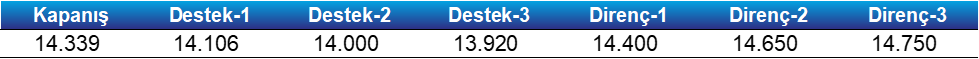 - Endeksi teknik açıdan değerlendirdiğimizde, yukarı yönlü hareketlerde 14.400 seviyesini kısa vadeli direnç bölgesi olarak izleyeceğiz. Yükselişin devamı için bu seviyenin üzerinde kalıcılık sağlanması gerektiğini düşünüyoruz.