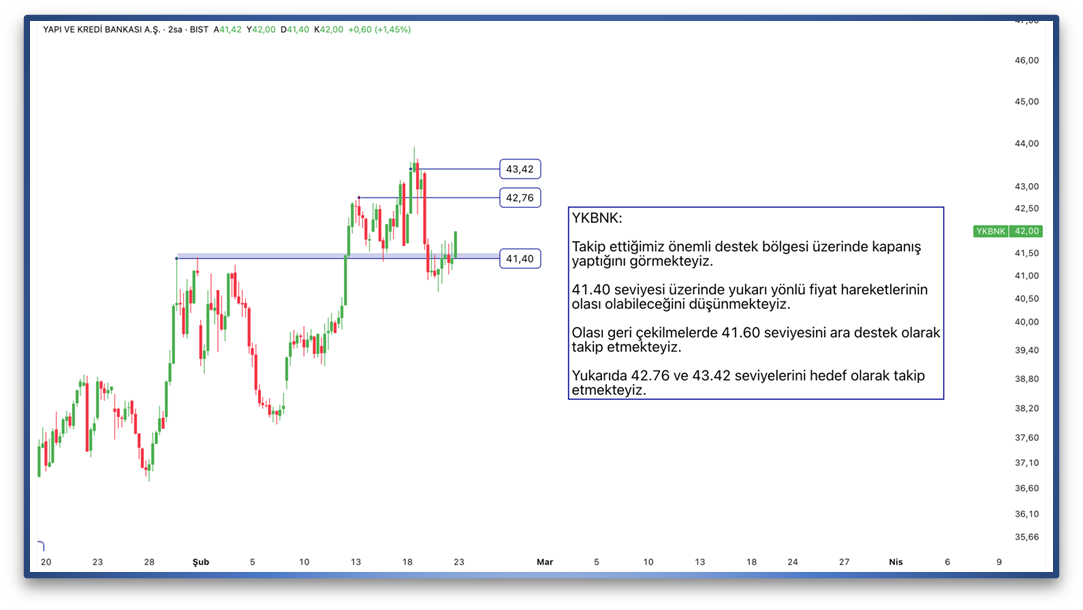 Takip ettiğimiz önemli destek bölgesi üzerinde kapanış yaptığını görmekteyiz. 41.40 seviyesi üzerinde yukarı yönlü fiyat hareketlerinin olası olabileceğini düşünmekteyiz. Olası geri çekilmelerde 41.60 seviyesini ara destek olarak takip etmekteyiz. Yukarıda 42.76 ve 43.42 seviyelerini hedef olarak takip etmekteyiz.