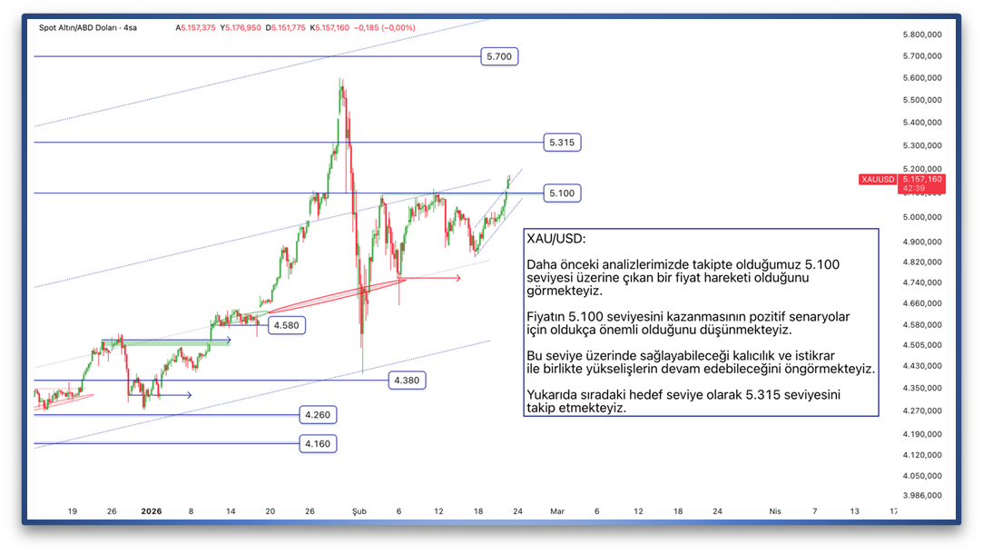 Daha önceki analizlerimizde takipte olduğumuz 5.100 seviyesi üzerine çıkan bir fiyat hareketi olduğunu görmekteyiz. Fiyatın 5.100 seviyesini kazanmasının pozitif senaryolar için oldukça önemli olduğunu düşünmekteyiz. Bu seviye üzerinde sağlayabileceği kalıcılık ve istikrar ile birlikte yükselişlerin devam edebileceğini öngörmekteyiz. Yukarıda sıradaki hedef seviye olarak 5.315 seviyesini takip etmekteyiz.