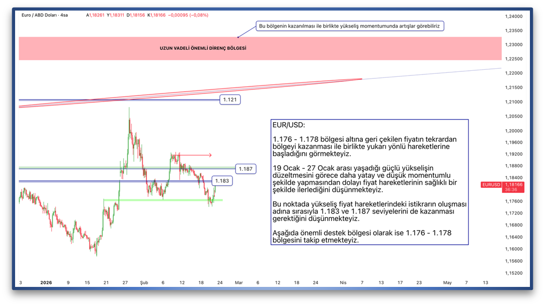 1.176 - 1.178 bölgesi altına geri çekilen fiyatın tekrardan bölgeyi kazanması ile birlikte yukarı yönlü hareketlerine başladığını görmekteyiz. 19 Ocak - 27 Ocak arası yaşadığı güçlü yükselişin düzeltmesini görece daha yatay ve düşük momentumlu şekilde yapmasından dolayı fiyat hareketlerinin sağlıklı bir şekilde ilerlediğini düşünmekteyiz. Bu noktada yükseliş fiyat hareketlerindeki istikrarın oluşması adına sırasıyla 1.183 ve 1.187 seviyelerini de kazanması gerektiğini düşünmekteyiz. Aşağıda önemli destek bölgesi olarak ise 1.176 - 1.178 bölgesini takip etmekteyiz.