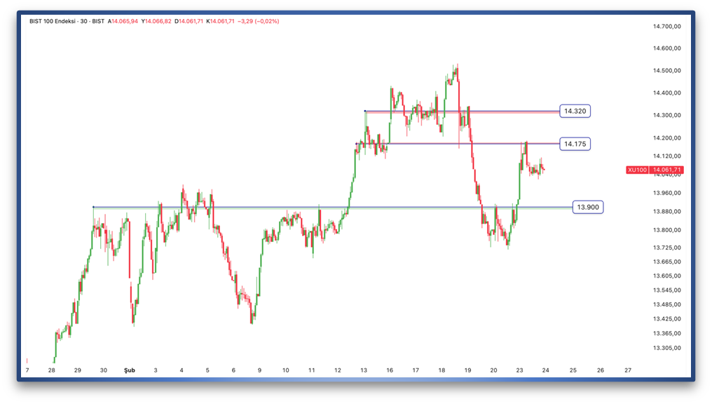 - Endeksi teknik açıdan değerlendirdiğimizde, 14.200 seviyesi üzerine çıkamadığını ve bununla birlikte satış baskısı yaşadığını takip ettik. 5 günlük üssel hareketli ortalamadan (14.031) tepki aldığını ve bu iki seviye arasında yataylık oluşturan bir fiyat hareketi olduğunu izledik. Güçlenme hareketinin yeniden başlayabilmesi için 14.175 - 14.200 bölgesinin kazanılmasını gerektiğini düşünüyoruz.