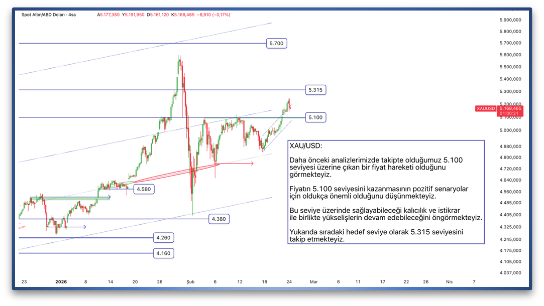 Daha önceki analizlerimizde takipte olduğumuz 5.100 seviyesi üzerine çıkan bir fiyat hareketi olduğunu görmekteyiz. Fiyatın 5.100 seviyesini kazanmasının pozitif senaryolar için oldukça önemli olduğunu düşünmekteyiz. Bu seviye üzerinde sağlayabileceği kalıcılık ve istikrar ile birlikte yükselişlerin devam edebileceğini öngörmekteyiz. Yukarıda sıradaki hedef seviye olarak 5.315 seviyesini takip etmekteyiz.