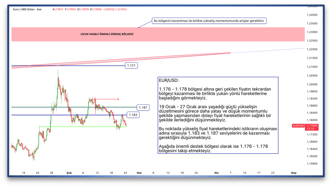 1.176 - 1.178 bölgesi altına geri çekilen fiyatın tekrardan bölgeyi kazanması ile birlikte yukarı yönlü hareketlerine başladığını görmekteyiz. 19 Ocak - 27 Ocak arası yaşadığı güçlü yükselişin düzeltmesini görece daha yatay ve düşük momentumlu şekilde yapmasından dolayı fiyat hareketlerinin sağlıklı bir şekilde ilerlediğini düşünmekteyiz. Bu noktada yükseliş fiyat hareketlerindeki istikrarın oluşması adına sırasıyla 1.183 ve 1.187 seviyelerini de kazanması gerektiğini düşünmekteyiz. Aşağıda önemli destek bölgesi olarak ise 1.176 - 1.178 bölgesini takip etmekteyiz.
