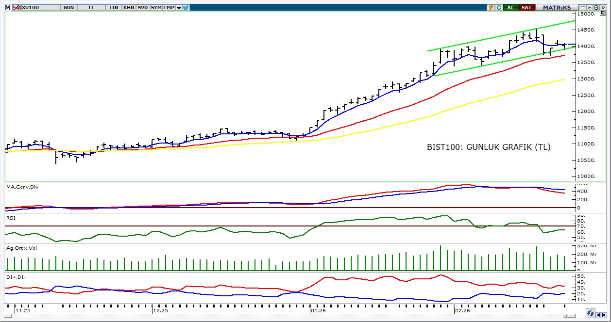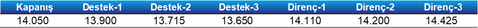 - Teknik görünümde, yukarı yönlü hareketlerde kısa vadeli direnç bölgesi olarak 14.110 - 14.200 bandını takip edeceğiz. Endeksin bu bandı aşması halinde, yükseliş ivmesinin güçlenebileceğini düşünüyoruz.