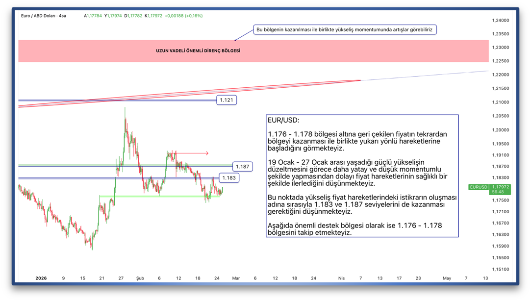 1.176 - 1.178 bölgesi altına geri çekilen fiyatın tekrardan bölgeyi kazanması ile birlikte yukarı yönlü hareketlerine başladığını görmekteyiz. 19 Ocak - 27 Ocak arası yaşadığı güçlü yükselişin düzeltmesini görece daha yatay ve düşük momentumlu şekilde yapmasından dolayı fiyat hareketlerinin sağlıklı bir şekilde ilerlediğini düşünmekteyiz. Bu noktada yükseliş fiyat hareketlerindeki istikrarın oluşması adına sırasıyla 1.183 ve 1.187 seviyelerini de kazanması gerektiğini düşünmekteyiz. Aşağıda önemli destek bölgesi olarak ise 1.176 - 1.178 bölgesini takip etmekteyiz.