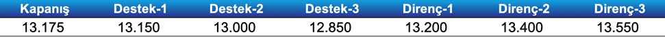 - Teknik açıdan yükselişlerin devamı adına yakın destek olan 13.150 seviyesi üzerindeki kalıcılığının olması gerektiğini ve yukarıda 22 günlük üssel hareketli ortalama bölgesi olan 13.380 - 13.400’ü yükselişlerin daha istikrarlı bir şekilde devamlılığı adına önemli direnç bölgesi olarak takip etmekteyiz.