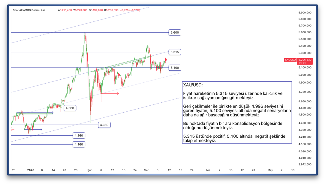 Fiyat hareketinin 5.315 seviyesi üzerinde kalıcılık ve istikrar sağlayamadığını görmekteyiz. Geri çekilmeler ile birlikte en düşük 4.996 seviyesini gören fiyatın, 5.100 seviyesi altında negatif senaryoların daha da ağır basacağını düşünmekteyiz. Bu noktada fiyatın bir ara konsolidasyon bölgesinde olduğunu düşünmekteyiz. 5.315 üstünde pozitif, 5.100 altında negatif şeklinde takip etmekteyiz.