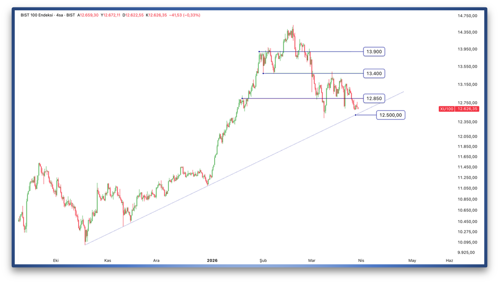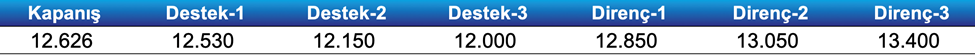 - Olası geri çekilmelerde ise yükseliş trendine denk gelen 12.500 seviyesini önemli bir destek noktası olarak takip ediyoruz. Bu seviyenin altında negatif görünümün sürmesi ve 12.000 seviyesine doğru geri çekilmenin devam etmesi beklenebilir.