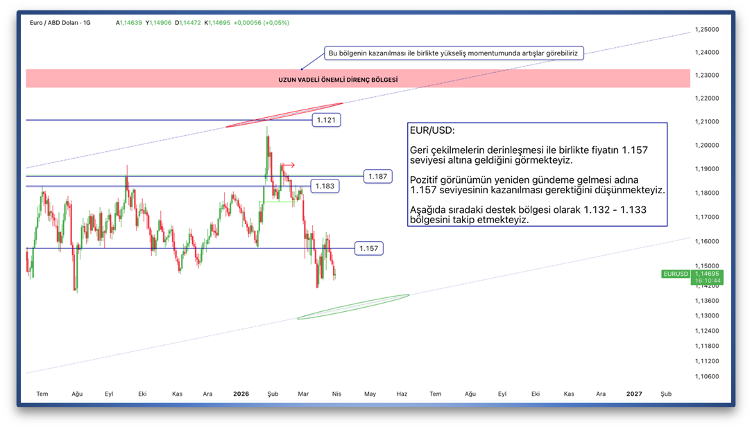 Geri çekilmelerin derinleşmesi ile birlikte fiyatın 1.157 seviyesi altına geldiğini görmekteyiz. Pozitif görünümün yeniden gündeme gelmesi adına 1.157 seviyesinin kazanılması gerektiğini düşünmekteyiz. Aşağıda sıradaki destek bölgesi olarak 1.132 - 1.133 bölgesini takip etmekteyiz.