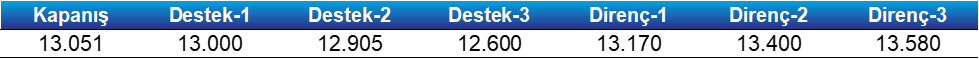 - Teknik açıdan bakıldığında, endeksin günü yeniden 13.000 puan seviyesinin üzerinde tamamlaması kısa vadeli görünüm açısından önemli bir gelişme olarak değerlendiriyoruz. Yukarı yönlü hareketlerin devamı açısından bu kritik seviyenin korunması gerektiğini düşünüyoruz. Bu durumda yükselişin sürmesi halinde ilk direnç noktası olarak 13.170 seviyesi izlenebilir. Bu seviyenin aşılması durumunda ise 13.400 direnç bölgesi gündeme gelebilir.