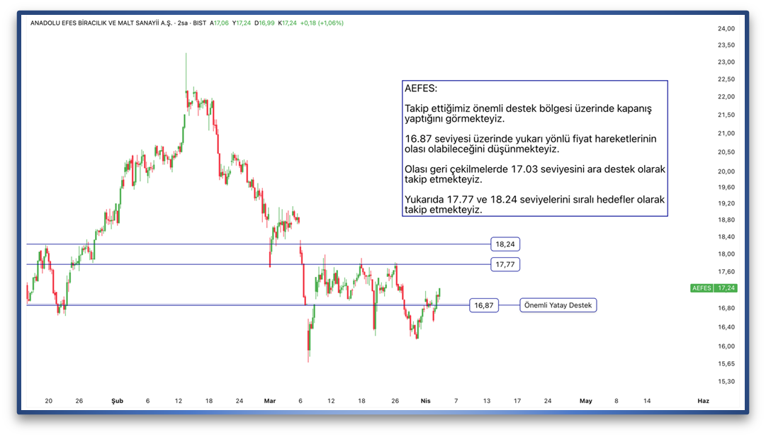 Takip ettiğimiz önemli destek bölgesi üzerinde kapanış yaptığını görmekteyiz. 16.87 seviyesi üzerinde yukarı yönlü fiyat hareketlerinin olası olabileceğini düşünmekteyiz. Olası geri çekilmelerde 17.03 seviyesini ara destek olarak takip etmekteyiz. Yukarıda 17.77 ve 18.24 seviyelerini sıralı hedefler olarak takip etmekteyiz.
