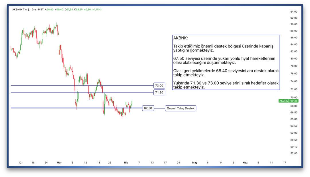 Takip ettiğimiz önemli destek bölgesi üzerinde kapanış yaptığını görmekteyiz. 67.50 seviyesi üzerinde yukarı yönlü fiyat hareketlerinin olası olabileceğini düşünmekteyiz. Olası geri çekilmelerde 68.40 seviyesini ara destek olarak takip etmekteyiz. Yukarıda 71.30 ve 73.00 seviyelerini sıralı hedefler olarak takip etmekteyiz.