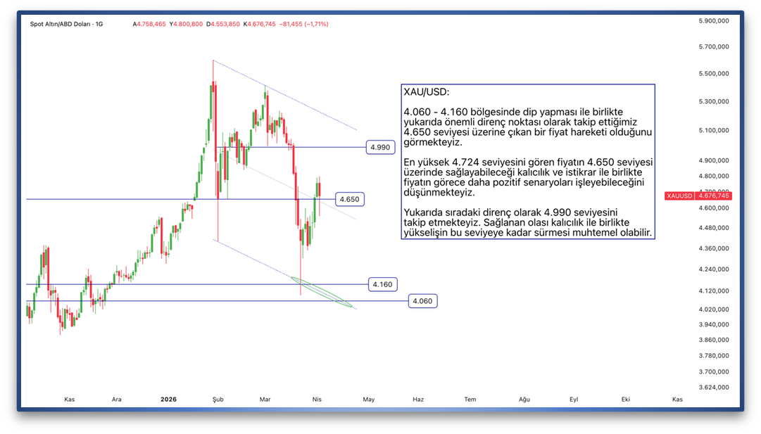 4.060 - 4.160 bölgesinde dip yapması ile birlikte yukarıda önemli direnç noktası olarak takip ettiğimiz 4.650 seviyesi üzerine çıkan bir fiyat hareketi olduğunu görmekteyiz. En yüksek 4.724 seviyesini gören fiyatın 4.650 seviyesi üzerinde sağlayabileceği kalıcılık ve istikrar ile birlikte fiyatın görece daha pozitif senaryoları işleyebileceğini düşünmekteyiz. Yukarıda sıradaki direnç olarak 4.990 seviyesini takip etmekteyiz. Sağlanan olası kalıcılık ile birlikte yükselişin bu seviyeye kadar sürmesi muhtemel olabilir.