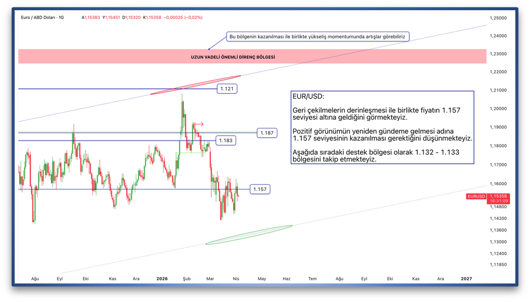 Geri çekilmelerin derinleşmesi ile birlikte fiyatın 1.157 seviyesi altına geldiğini görmekteyiz. Pozitif görünümün yeniden gündeme gelmesi adına 1.157 seviyesinin kazanılması gerektiğini düşünmekteyiz. Aşağıda sıradaki destek bölgesi olarak 1.132 - 1.133 bölgesini takip etmekteyiz.