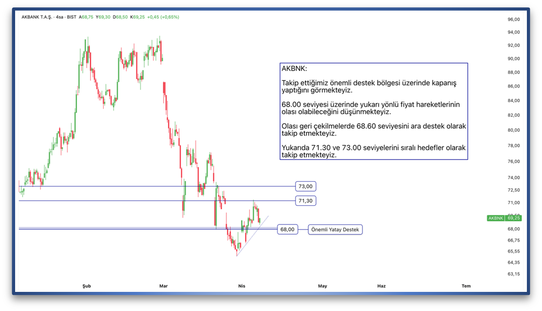 Takip ettiğimiz önemli destek bölgesi üzerinde kapanış yaptığını görmekteyiz. 68.00 seviyesi üzerinde yukarı yönlü fiyat hareketlerinin olası olabileceğini düşünmekteyiz. Olası geri çekilmelerde 68.60 seviyesini ara destek olarak takip etmekteyiz. Yukarıda 71.30 ve 73.00 seviyelerini sıralı hedefler olarak takip etmekteyiz.
