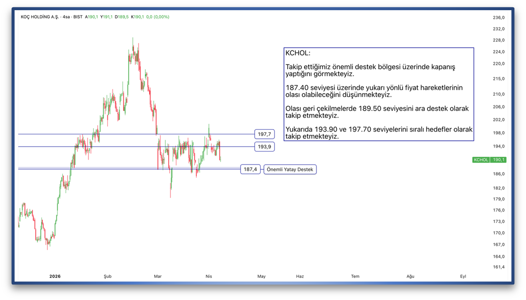 Takip ettiğimiz önemli destek bölgesi üzerinde kapanış yaptığını görmekteyiz. 187.40 seviyesi üzerinde yukarı yönlü fiyat hareketlerinin olası olabileceğini düşünmekteyiz. Olası geri çekilmelerde 189.50 seviyesini ara destek olarak takip etmekteyiz. Yukarıda 193.90 ve 197.70 seviyelerini sıralı hedefler olarak takip etmekteyiz.