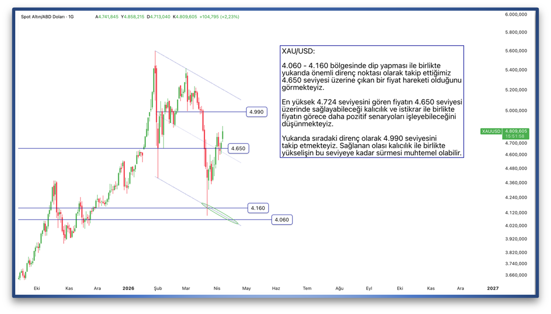 4.060 - 4.160 bölgesinde dip yapması ile birlikte yukarıda önemli direnç noktası olarak takip ettiğimiz 4.650 seviyesi üzerine çıkan bir fiyat hareketi olduğunu görmekteyiz. En yüksek 4.724 seviyesini gören fiyatın 4.650 seviyesi üzerinde sağlayabileceği kalıcılık ve istikrar ile birlikte fiyatın görece daha pozitif senaryoları işleyebileceğini düşünmekteyiz. Yukarıda sıradaki direnç olarak 4.990 seviyesini takip etmekteyiz. Sağlanan olası kalıcılık ile birlikte yükselişin bu seviyeye kadar sürmesi muhtemel olabilir.