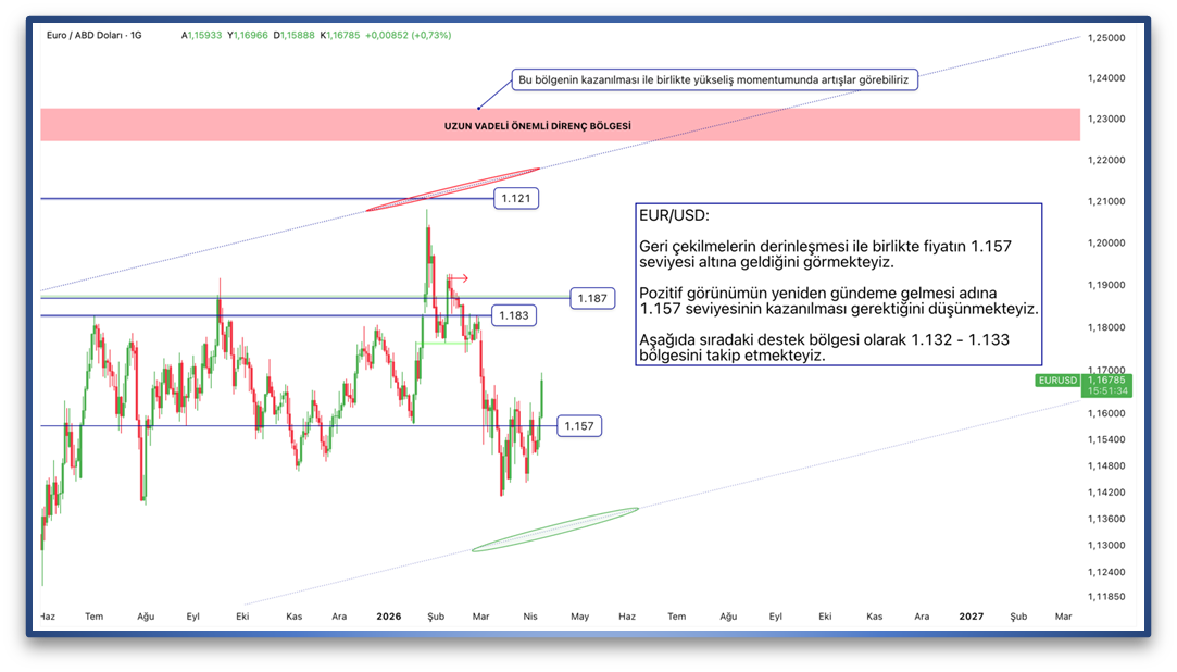Geri çekilmelerin derinleşmesi ile birlikte fiyatın 1.157 seviyesi altına geldiğini görmekteyiz. Pozitif görünümün yeniden gündeme gelmesi adına 1.157 seviyesinin kazanılması gerektiğini düşünmekteyiz. Aşağıda sıradaki destek bölgesi olarak 1.132 - 1.133 bölgesini takip etmekteyiz.